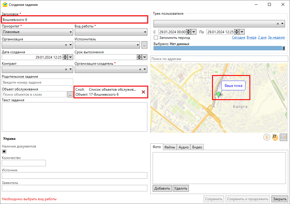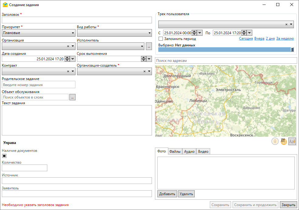 Параметры, отмеченные символом «*», являются обязательными для заполнения при создании задания. Если после заполнения полей кнопка «Сохранить» остается неактивной, в левом нижнем углу окна создания задания появляется подсказка красного цвета с описанием причины подобного поведения и действий по его устранению. Это может произойти, если не заполнено одно из обязательных полей или в случае несоответствия контракта и вида работ или организации-исполнителя.