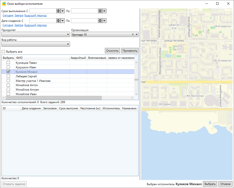 В данном окне можно найти ранее назначенных исполнителей, отфильтровав по сроку выполнения и дате создания назначенных заданий, приоритету, организации и виду работы.