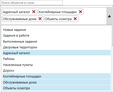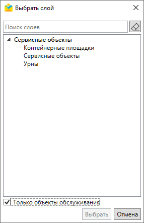 справа от поля поиска объектов обслуживания открывает отдельное окно выбора слоя или таблицы для поиска. По умолчанию включены только слои объектов обслуживания (Рис. 2.166).