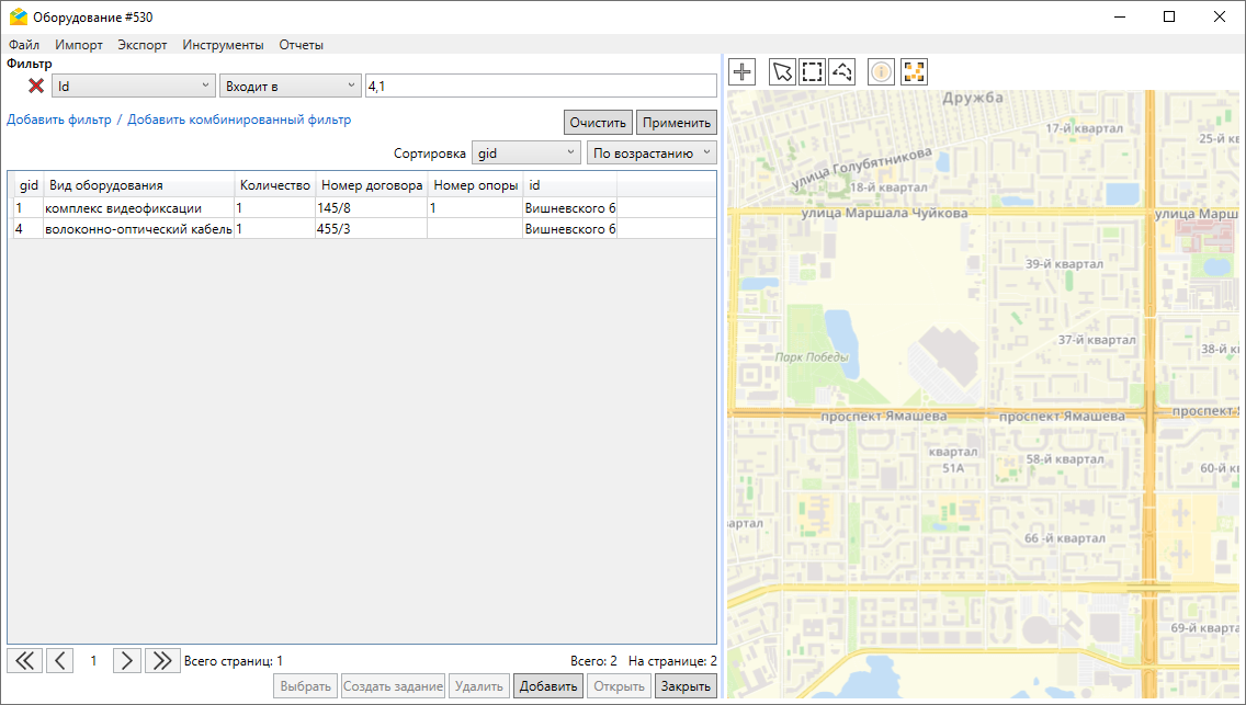 По двойному щелчку по названию слоя/таблицы или после выделения названия и нажатия кнопки «Выбрать» откроется окно слоя/таблицы, где можно найти интересующий объект (вручную, в поле поиска или с использованием фильтров). Объект обслуживания можно назначить и после создания задания. Удаление и редактирование объекта обслуживания в задании невозможно.
