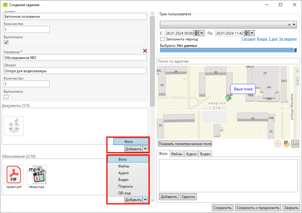 При наличии настраиваемого поля формата «Файл» можно прикрепить к заданию файлы, нажав на кнопку «Добавить» под полем и выбрав один из форматов из выпадающего списка. Настройка полей осуществляется в «MapSurfer». Поддерживается добавление как одного, так и нескольких форматов файлов в одном поле (Рис. 2.174).