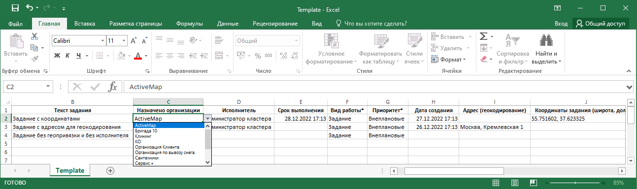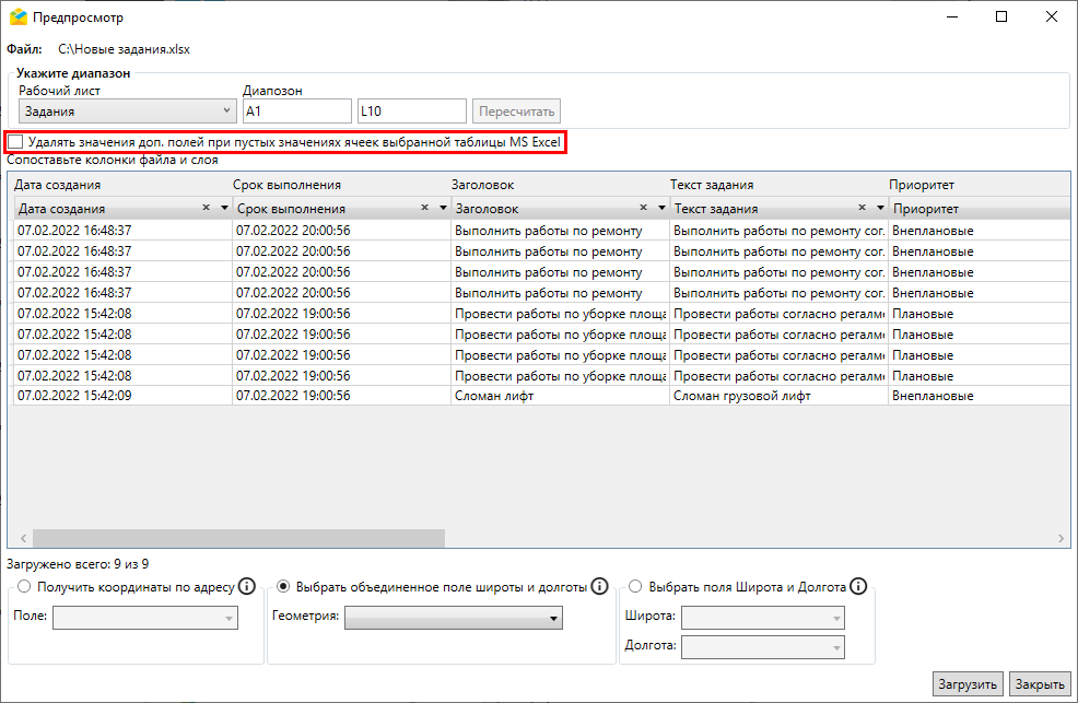 Также возможно одновременно использовать поле таблицы для указания координат и для заполнения настраиваемого поля задания. После того как все значения отмечены, следует нажать «Загрузить» для старта импорта, «Закрыть» — для отмены. Если кнопка не активна, в нижней части окна отобразится сообщение о причинах заблокированного состояния кнопки «Загрузить». Данное сообщение отображается в окнах «Импорта/обновления заданий», «Импорта таблицы из MS Excel» и «Импорта/обновления объектов». Импорт невозможен, если в импортируемой таблице есть несколько полей с одинаковыми названиями.
