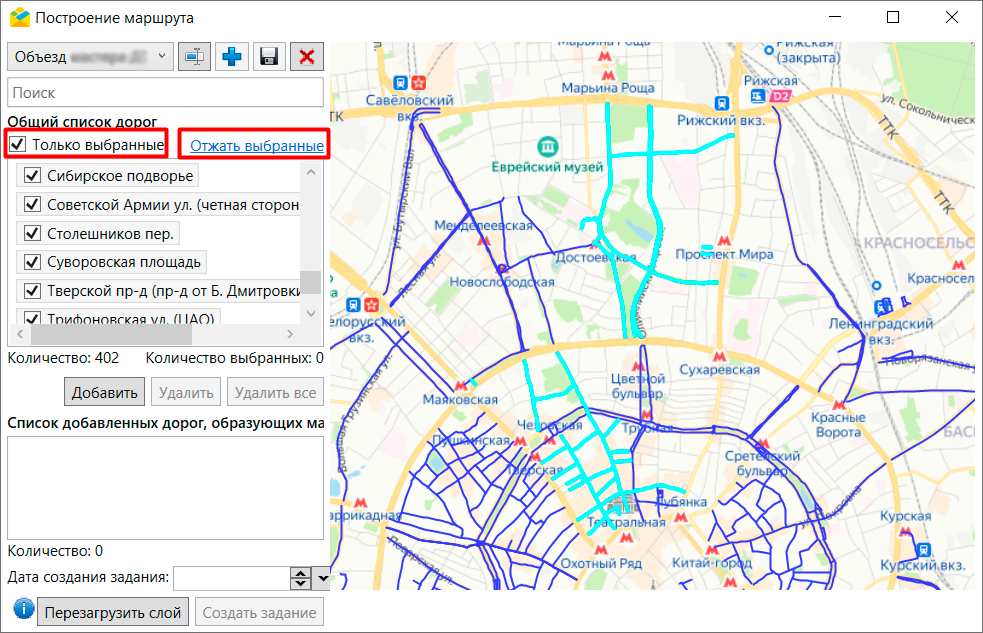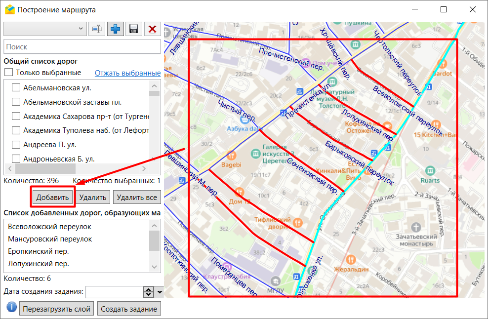 Необходимо нажать «Добавить», чтобы переместить выбранные дороги в блок маршрутов.