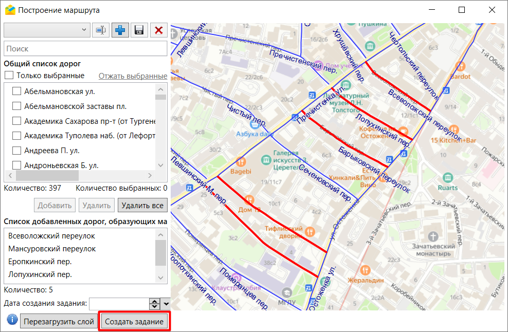 Как только в блоке списка добавленных дорог появятся данные, активируется кнопка «Создать задание» (Рис. 2.202).