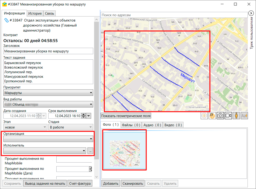 После нажатия на кнопку будет создано задание и откроется окно редактирования. В этом окне необходимо указать организацию, исполнителя задания и нажать «Сохранить» (Рис. 2.203). В задание будет автоматически приложено изображение, содержащее базовую карту и необходимый к прохождению маршрут. На карте также будут отображены выбранные дороги.