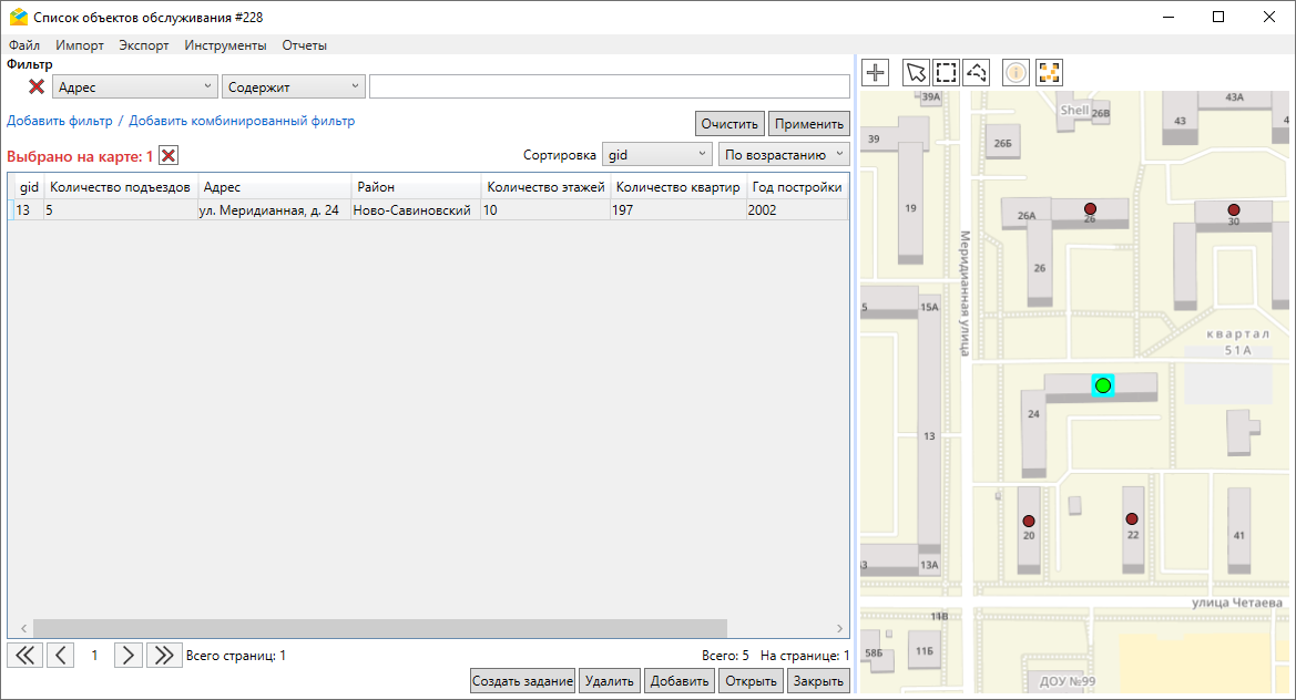 Для завершения создания следует нажать «Сохранить». Созданный объект отобразится в таблице и на карте в окне слоя объектов обслуживания.