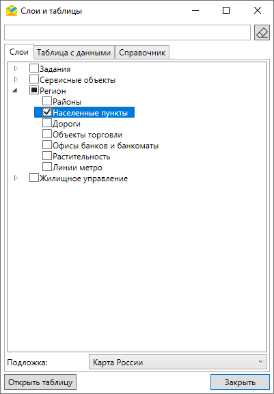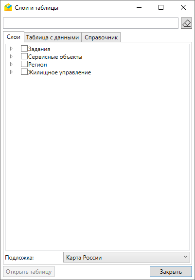 Для работы с табличными данными следует перейти в раздел меню «Слои и таблицы». Откроется окно со вкладками «Слои», «Таблицы с данными» и «Справочник» (Рис. 2.98). Используя строку поиска, можно найти необходимую таблицу.
