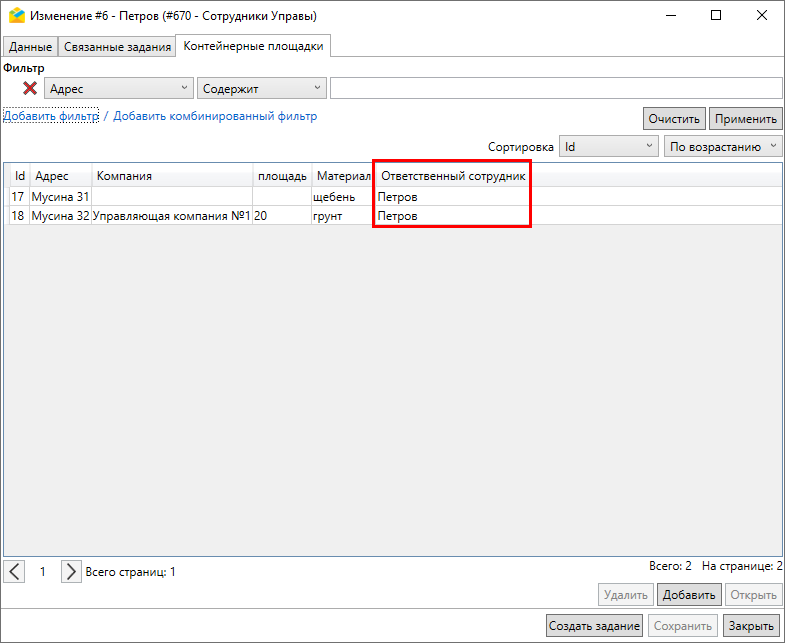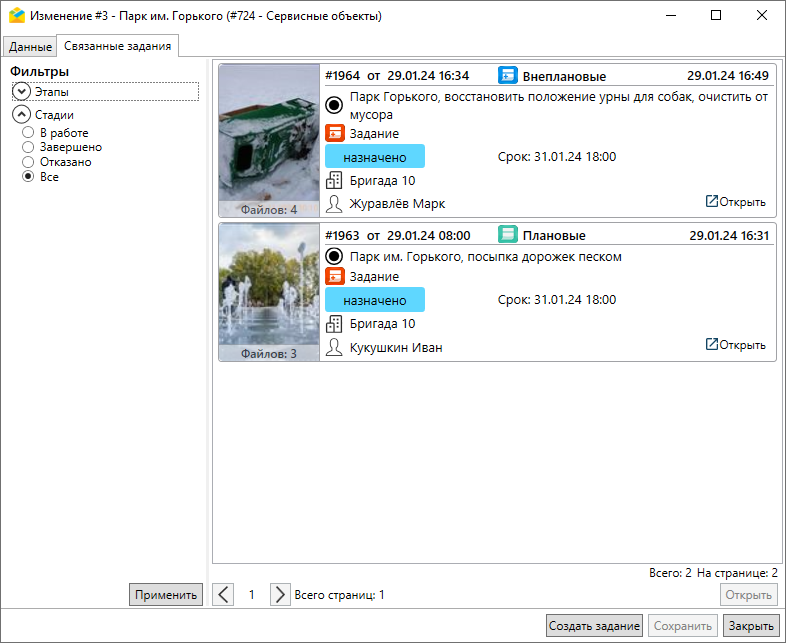 Во вкладке «Связанные задания» можно просмотреть и отредактировать все задания, связанные с данным объектом обслуживания (Рис. 2.124). Для облегчения поиска можно воспользоваться фильтрами в левой части окна.