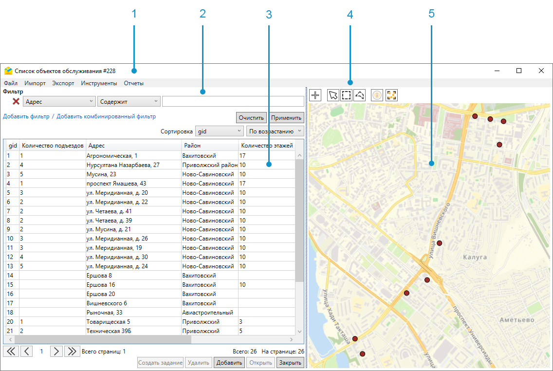 и срабатывает как фильтр для списка объектов (после выбора на карте в таблице слева от карты отобразятся только строки с выделенными объектами — Рис. 2.108). Для того чтобы очистить результаты фильтра «Выбор на карте», нужно нажать «Закрыть»