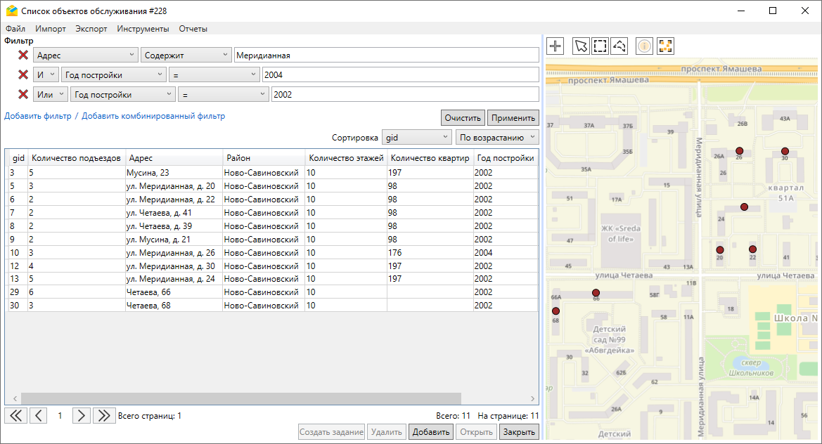 Для облегчения поиска объектов можно использовать фильтры, сортировать строки таблицы и выбирать объекты на карте. Можно указать несколько условий фильтрации, добавляя обычные и комбинированные фильтры. Комбинированные фильтры устанавливают приоритеты для условий (аналог скобок). Для перемещения к результатам фильтрации на карте следует нажать кнопку «Вписать в карту»