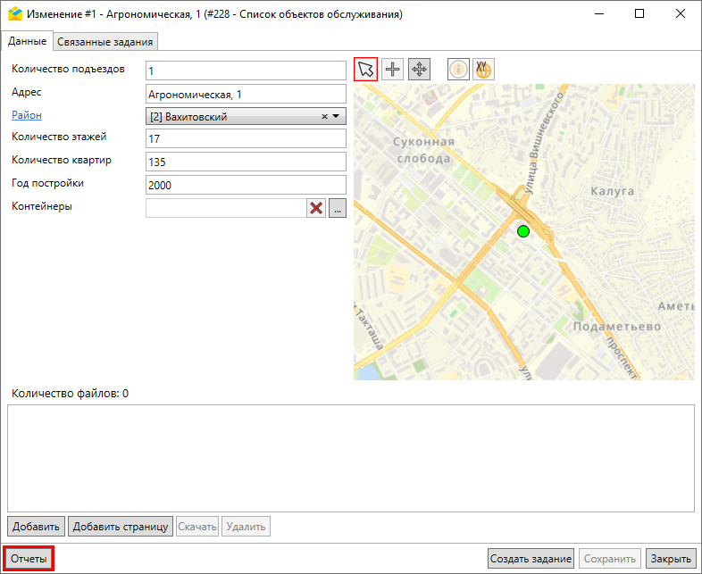 Данное окно предназначено для редактирования, добавления и удаления объектов, а также для создания заданий с привязкой к объектам обслуживания. Окно содержит следующие элементы: