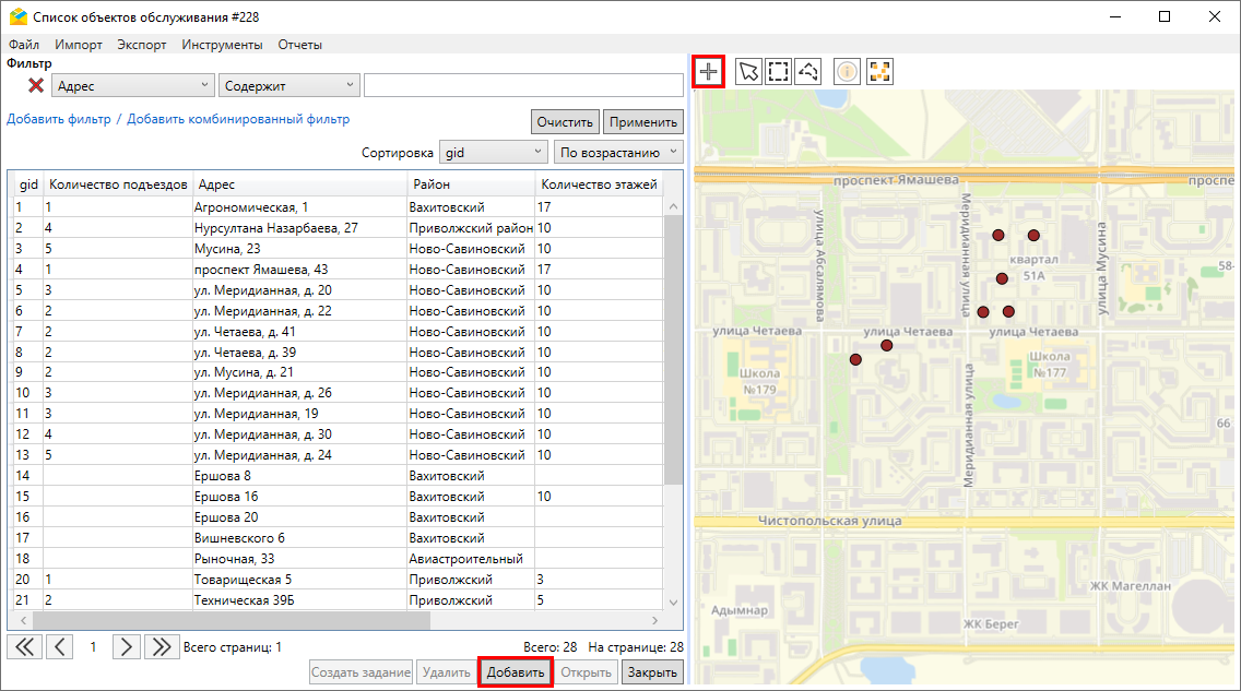Для создания нового объекта обслуживания необходимо нажать «Добавить» в нижней части окна слоя сервисных объектов или отметить положение объекта на карте с помощью инструмента