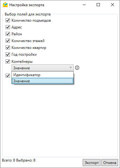 Выбрать поля для экспорта в открывшемся окне «Настройки экспорта» (Рис. 2.128). Для полей, привязанных к слою или таблице с данными, указать тип данных для выгрузки: id или значение. Выбранные настройки сохраняются в рамках рабочей сессии пользователя. Нажать кнопку «Экспорт».