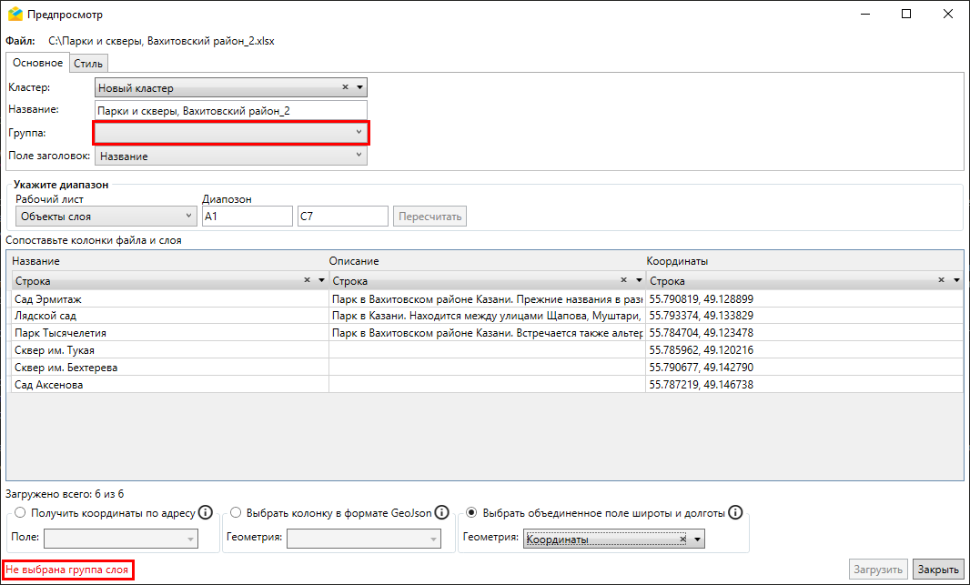 После того как все значения отмечены, следует нажать «Загрузить» для старта импорта, «Закрыть» — для отмены. Если кнопка не активна, в нижней части окна отобразится сообщение о причинах заблокированного состояния кнопки «Загрузить». Данное сообщение отображается в окнах «Импорта/обновления заданий», «Импорта таблицы из MS Excel» и «Импорта/обновления объектов». Импорт невозможен, если не указана группа слоя (Рис. 2.119), если в импортируемой таблице есть несколько полей с одинаковыми названиями.