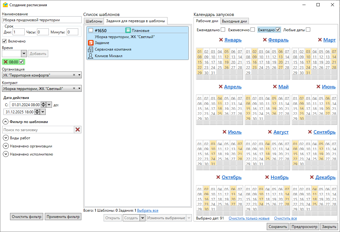 В системе представлено несколько вариантов для заполнения: еженедельно, ежемесячно, ежегодно или в любые даты. Если даты установлены за пределами срока действия расписания, то задания в эти даты не создаются.