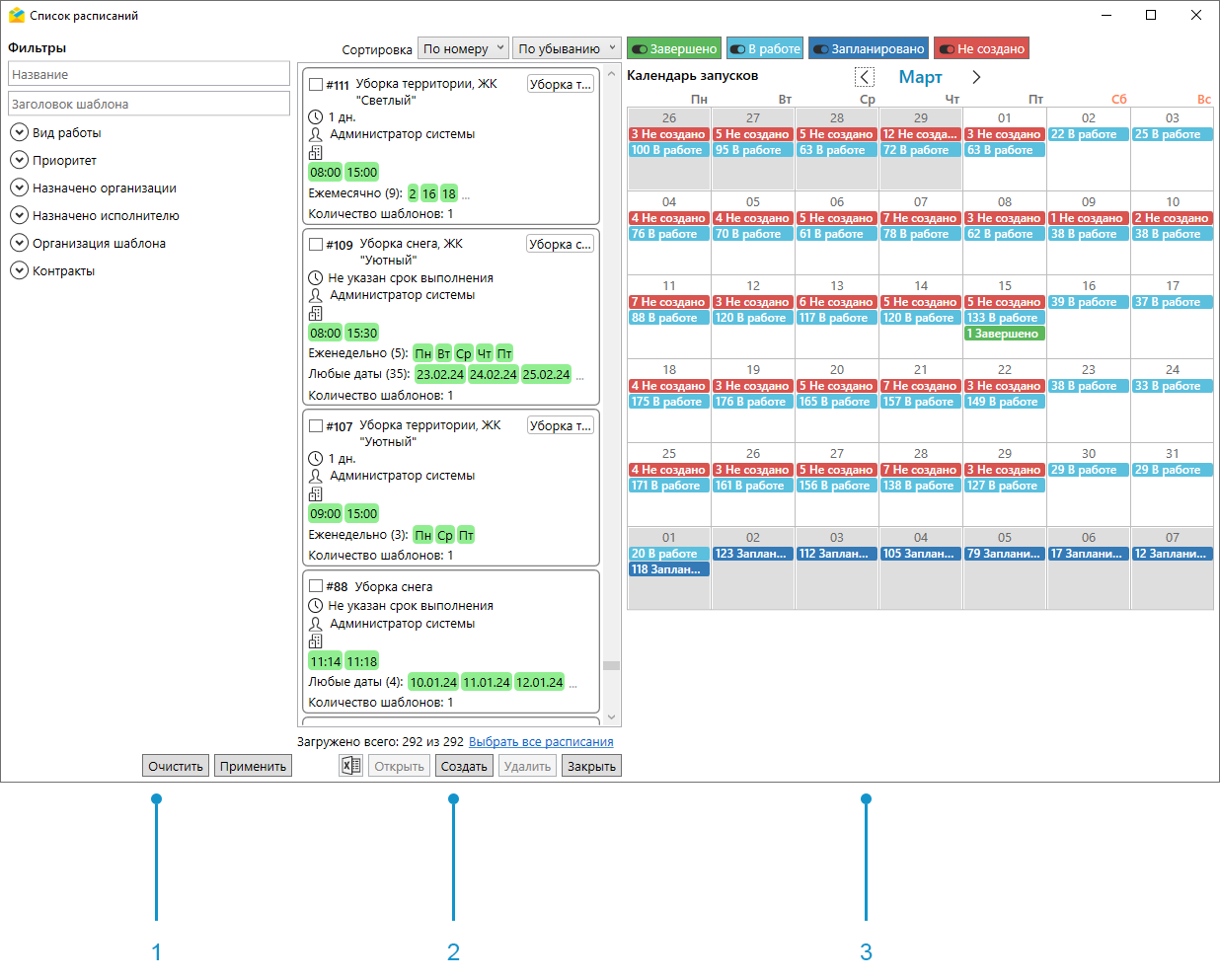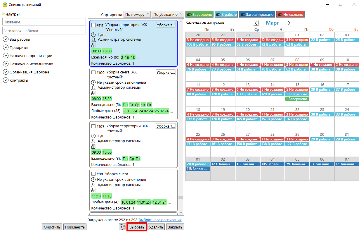 С помощью фильтра по шаблонам можно добавить в расписание не только выбранные задания, но и ранее созданные шаблоны. Фильтрация может вестись по заголовку шаблона, видам работ, организации и исполнителю.