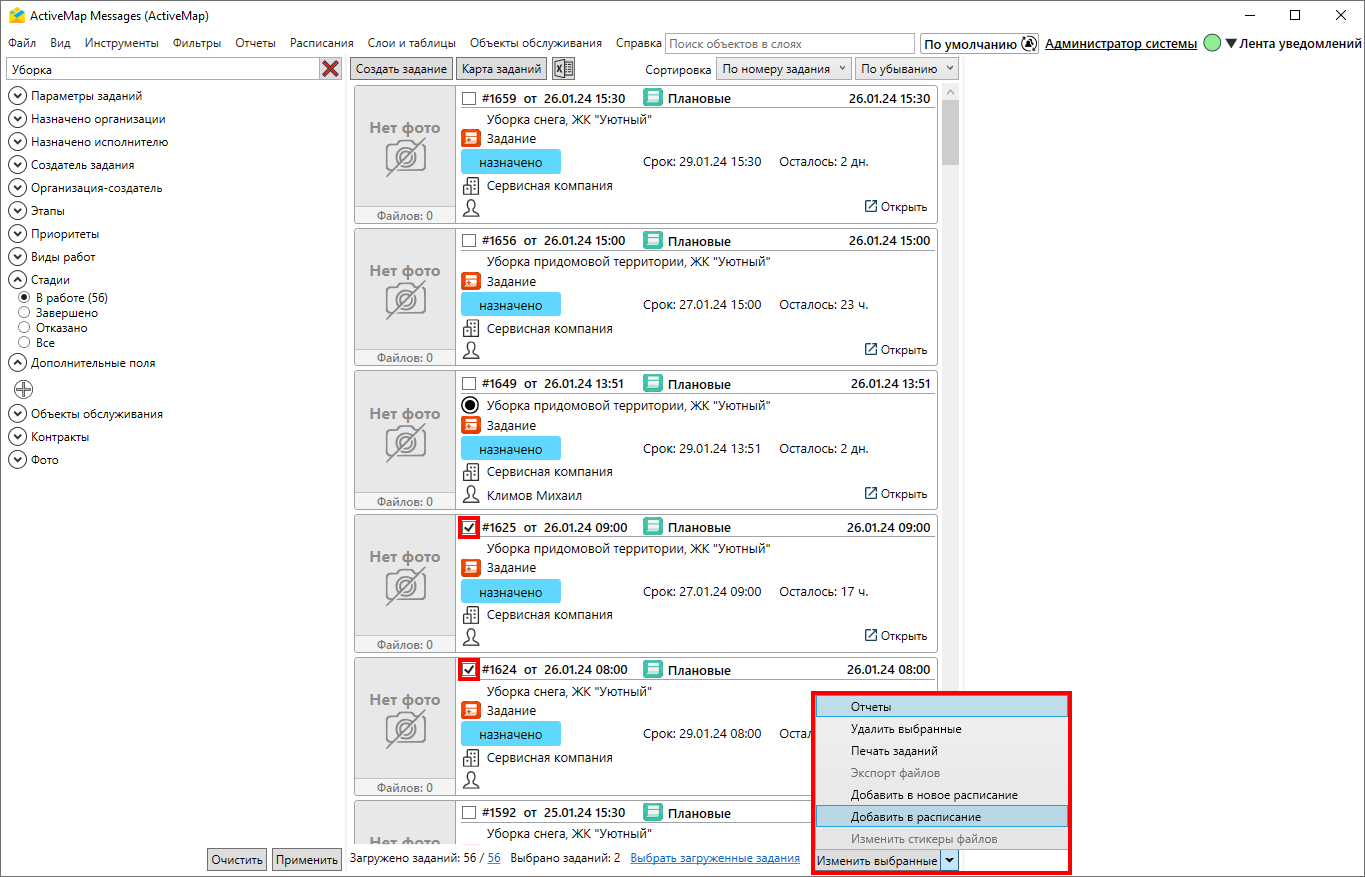 Для редактирования существующих расписаний путем добавления в них заданий, выбранных в области списка заданий, используется операция «Добавить в расписание» из выпадающего списка в правом нижнем углу области списка заданий (Рис. 2.215).