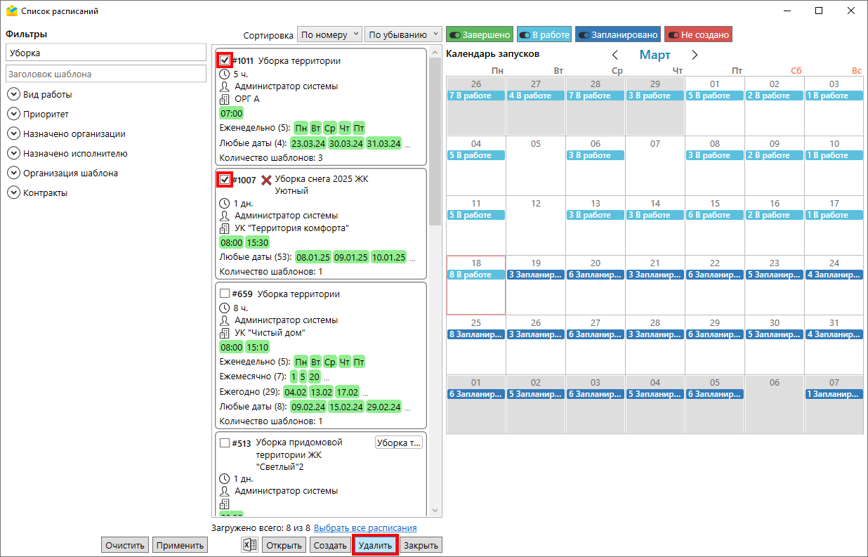 Для удаления нескольких расписаний следует проставить галочки в карточках интересующих расписаний и нажать кнопку «Удалить» (Рис. 2.228).