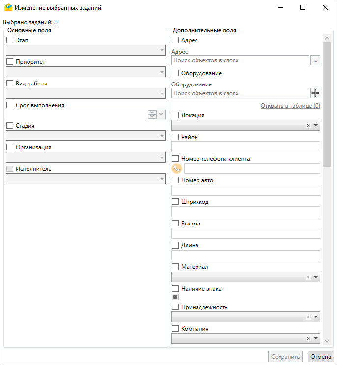 Когда в области списка заданий есть одно или несколько выбранных заданий, отмеченных галочкой, в правом нижнем углу области списка становятся активными кнопки для выполнения различных операций над выборкой. При нажатии на кнопку «Изменить выбранные» появится окно, в котором можно изменить основные и дополнительные поля задания (Рис. 2.140). При установке галочек напротив изменяемых параметров активируются выпадающие списки с возможными значениями параметров. После обновления полей соответствующая запись отобразится в истории всех заданий, даже если это поле недоступно для определенного задания, но оно попало при фильтрации в список для обновления.