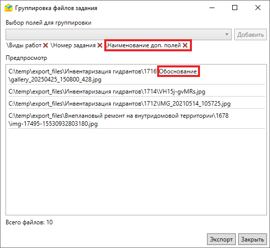 Экспортируемые файлы можно сгруппировать в папки по одному или нескольким параметрам из выпадающего списка: номеру задания, заголовку, полям задания и стикерам. После выбора параметра из списка следует нажать кнопку «Добавить». Можно добавить несколько параметров группировки, они будут учитываться при формировании папок в порядке их добавления. Это отобразится в окне предпросмотра, где можно увидеть полные пути файлов (Рис. 2.146).