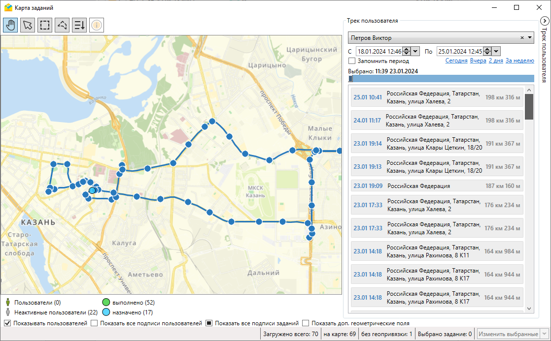 Для отображения пользователя на карте должен быть настроен мониторинг его передвижения через web-интерфейс системы (в «MapSurfer»). В правой части окна расположена панель трека пользователя, позволяющая наблюдать за передвижением исполнителей за определенный период (Рис. 2.152). Этот период можно настроить и запомнить, чтобы он автоматически отображался в окне карты для всех заданий.