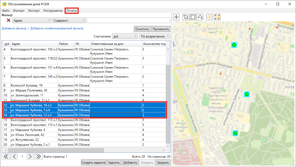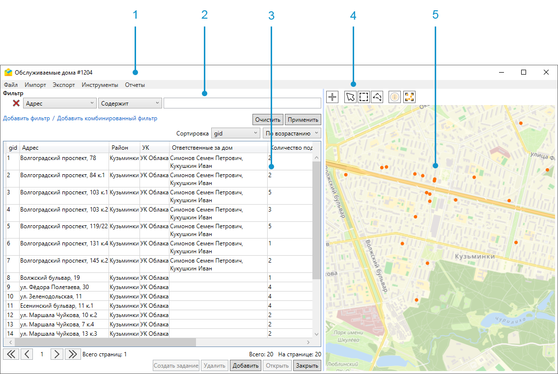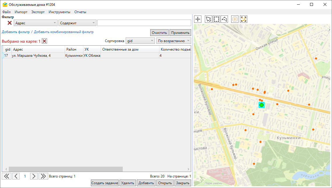 и срабатывает как фильтр для списка объектов (после выбора на карте в таблице слева от карты отобразятся только строки с выделенными объектами — Рис. 2.110). Для того чтобы очистить результаты фильтра «Выбор на карте», нужно нажать «Закрыть»