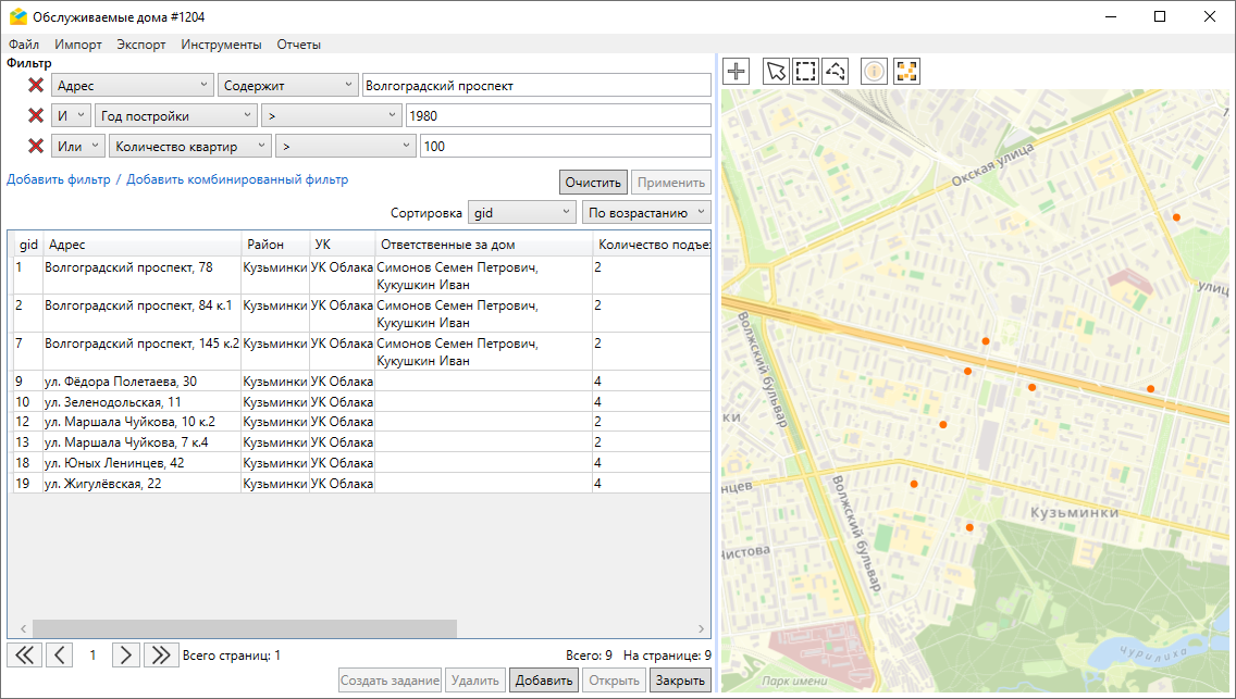 На рисунке Рис. 2.109 приведен пример результата использования комбинированного фильтра («Адрес» содержит «Волгоградский проспект» и («Год постройки»>1980 или «Количество квартир»>100)).