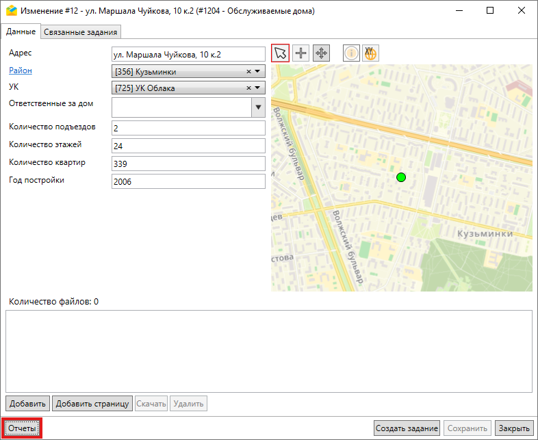 Во вкладке «Данные» можно отредактировать атрибутивные данные, местоположение объекта на карте, ввести координаты объекта, если они не были введены ранее, добавить страницу, добавить, скачать или удалить прикрепленные файлы с помощью контекстного меню или кнопок в нижней части окна. Файлы можно добавлять путем перетаскивания из открытой папки. Кнопки «Скачать» и «Удалить» становятся активными после выбора одного или нескольких файлов.
