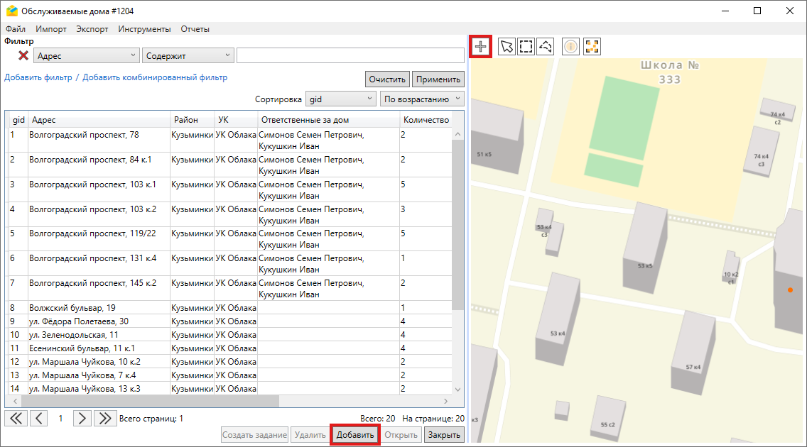 Окно слоя предназначено для редактирования, добавления и удаления объектов, а также для создания заданий с привязкой к объектам обслуживания. Оно содержит следующие элементы: