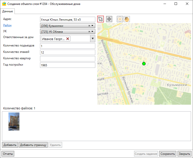 После подтверждения копирования выйдет окно создания объекта, где можно отредактировать атрибутивную информацию, местоположение, добавить новые или удалить ранее прикрепленные файлы. Для завершения создания копии следует нажать «Сохранить», для отмены — «Закрыть».