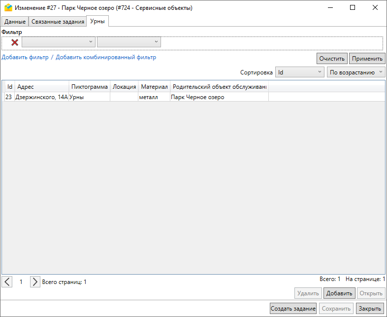 Во вкладке «Связанные задания» можно просмотреть, отредактировать, экспортировать и удалить все задания, связанные с данным объектом (Рис. 2.126). Для облегчения поиска можно воспользоваться фильтрами в левой части окна.