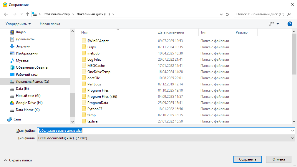 Перейти в раздел меню «Экспорт» окна объектов слоя и выбрать пункт «Экспорт данных в файл MS Excel». Откроется окно сохранения файла (Рис. 2.129). Необходимо ввести свое имя файла или оставить текущее и нажать кнопку «Сохранить».