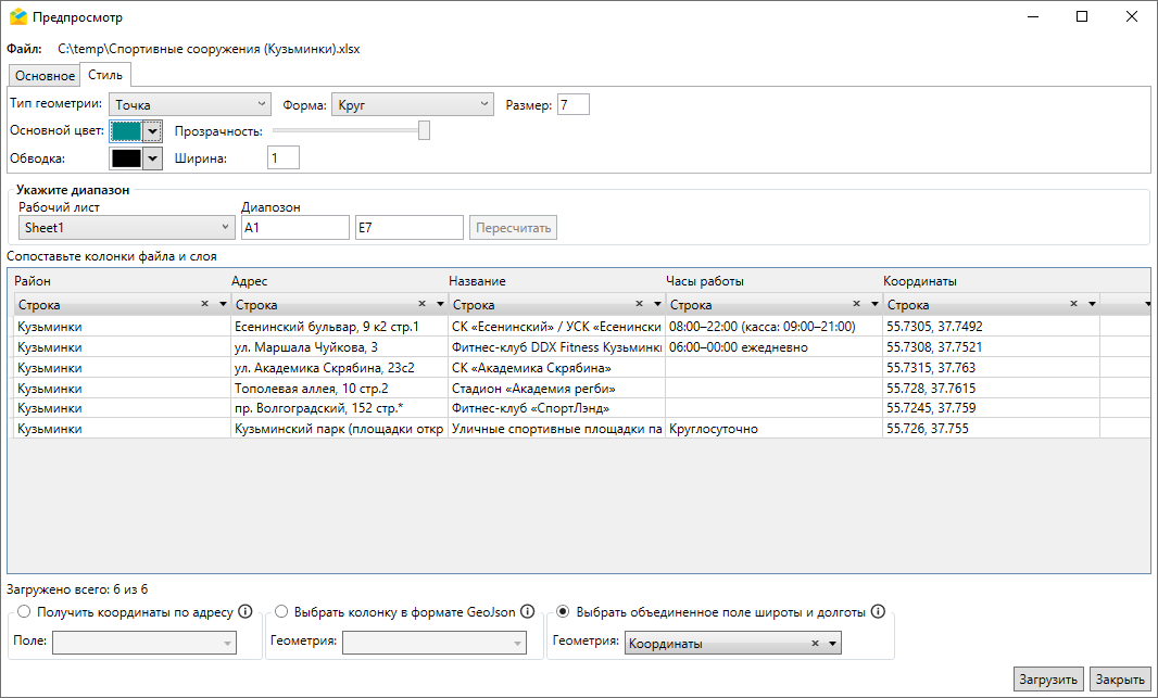 Для массовой загрузки объектов в существующий слой необходимо открыть окно слоя, в нем перейти в раздел «Импорт», во вкладку «Импортировать объекты из MS Excel» и выбрать интересующий *.xlsx-файл. Откроется окно предпросмотра с настройками импорта файла (Рис. 2.122), где можно указать импортируемые листы и диапазон ячеек, сопоставить колонки файла и слоя и выбрать поле с адресом для автоматического геокодирования или геометрией в одном из форматов: GeoJson (для точечных, линейных и полигональных объектов), объединенное поле или раздельные поля широты и долготы (для точечных объектов).