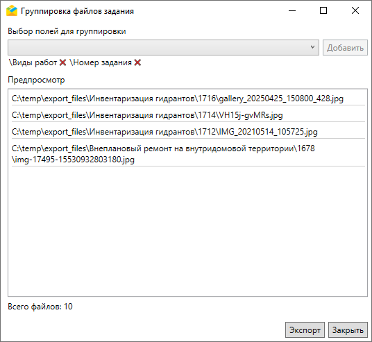 Экспортируемые файлы можно сгруппировать в папки по одному или нескольким параметрам из выпадающего списка: номеру задания, заголовку, полям задания и стикерам. После выбора параметра из списка следует нажать кнопку «Добавить». Можно добавить несколько параметров группировки, они будут учитываться при формировании папок в порядке их добавления. Это отобразится в окне предпросмотра, где можно увидеть полные пути файлов (Рис. 2.153).