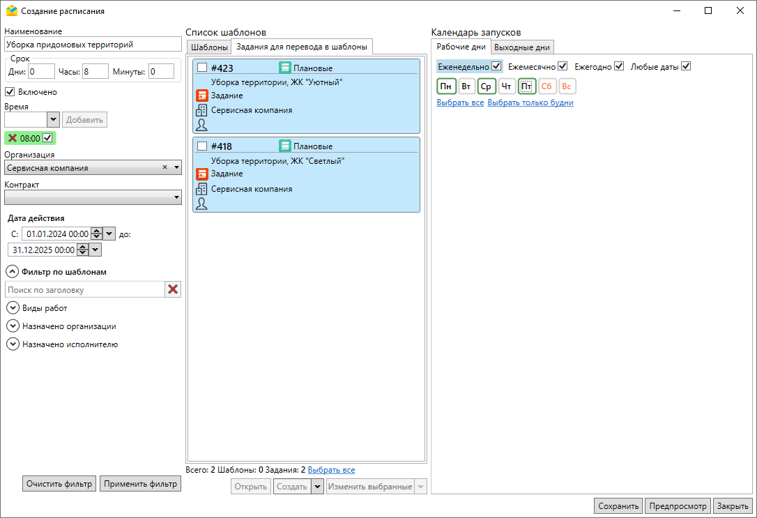 «Добавить в новое расписание» – cоздание нового расписания, включающего выбранные задания в качестве шаблонов. При нажатии на соответствующий элемент списка откроется окно «Создание расписания» (Рис. 2.155). Подробнее создание расписаний описано в разделе Создание расписаний.