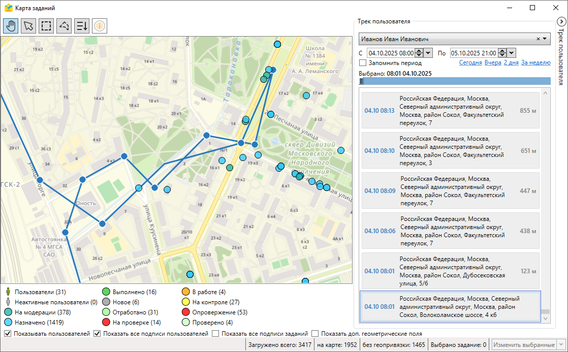 Для отображения пользователя на карте должен быть настроен мониторинг его передвижения через web-интерфейс системы (в «MapSurfer»). В правой части окна расположена панель трека пользователя, позволяющая наблюдать за передвижением исполнителей за определенный период (Рис. 2.159). Этот период можно настроить и запомнить, чтобы он автоматически отображался в окне карты для всех заданий.