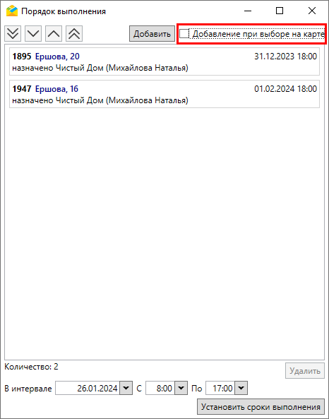 2.2.1. В окне «Порядок выполнения» снять галочку «Добавление при выборе на карте» (Рис. 2.162).
