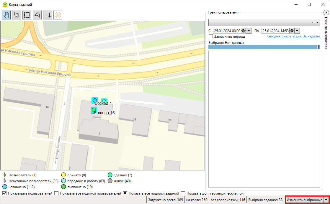 В нижней части окна продублирована кнопка «Изменить выбранные» (данная кнопка присутствует и в нижнем правом углу области списка заданий) (Рис. 2.168). Таким образом, можно выбрать одно или несколько заданий на карте и применить к ним массовые изменения, а также удалить или распечатать.