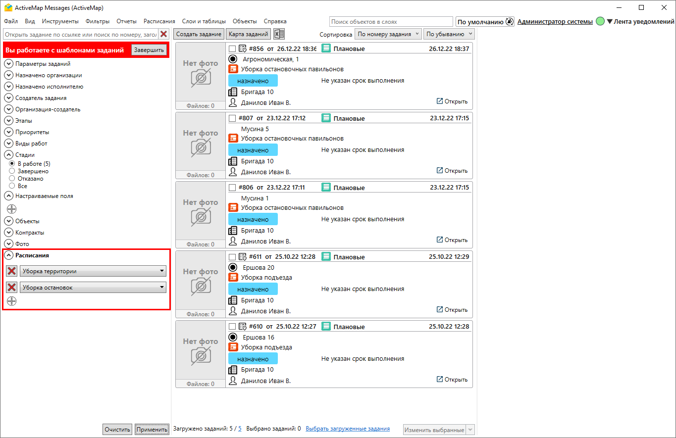 С помощью фильтра по шаблонам можно добавить в расписание не только выбранные задания, но и ранее созданные шаблоны. Фильтрация может вестись по заголовку шаблона, видам работ, организации и исполнителю.
