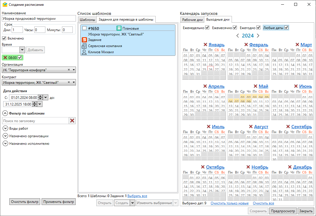 В системе представлено несколько вариантов для заполнения: еженедельно, ежемесячно, ежегодно или в любые даты. Если даты установлены за пределами срока действия расписания, то задания в эти даты не создаются.