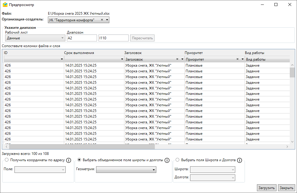 Здесь можно указать импортируемые листы и диапазон ячеек, выбрать колонки для импорта, сопоставить колонки файла и поля задания, а также выбрать поле с адресом для автоматического геокодирования или геометрией. Для пользователя с ролью администратора системы обязательно указать организацию-создателя задания. При совпадении названий колонок файла и полей задания Программа произведет автоматическое сопоставление, которое можно отредактировать вручную. После указания всех настроек следует нажать «Загрузить».