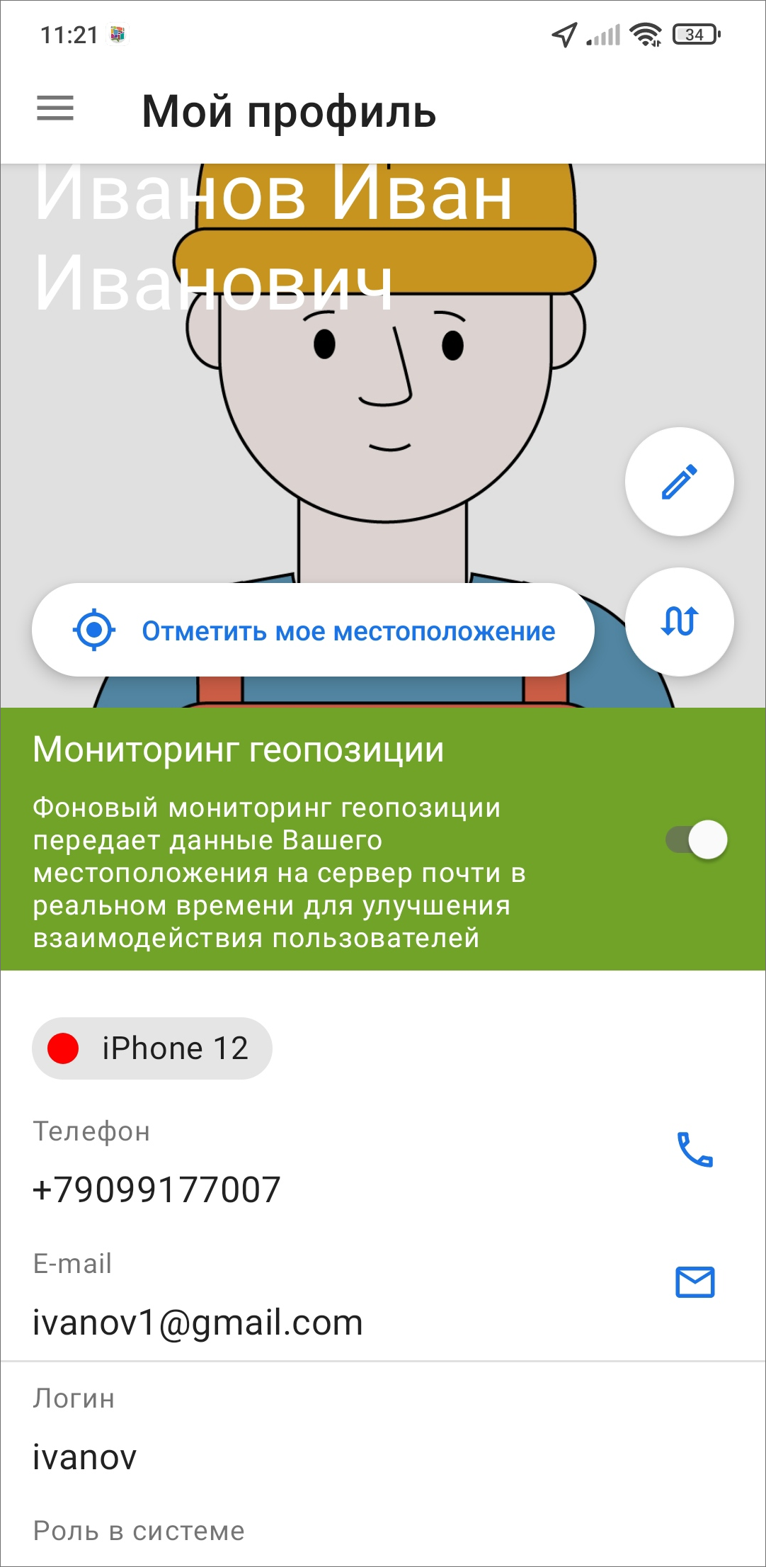 Чтобы попасть в учетную запись авторизованного пользователя, нужно перейти в боковое меню навигации. В верхней части бокового меню расположен профиль пользователя, где отображены его фотография (при наличии), сервер, на котором работает пользователь, индикатор работы мониторинга геопозиции и организация пользователя (Рис. 2.16).