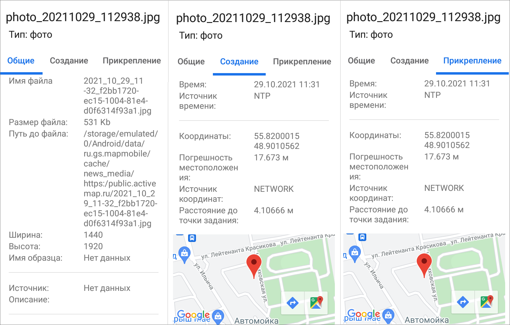В приложении есть возможность применить координаты фотографий к заданию. Для этого нужно длительно нажать на фотографию в задании, открыть меню