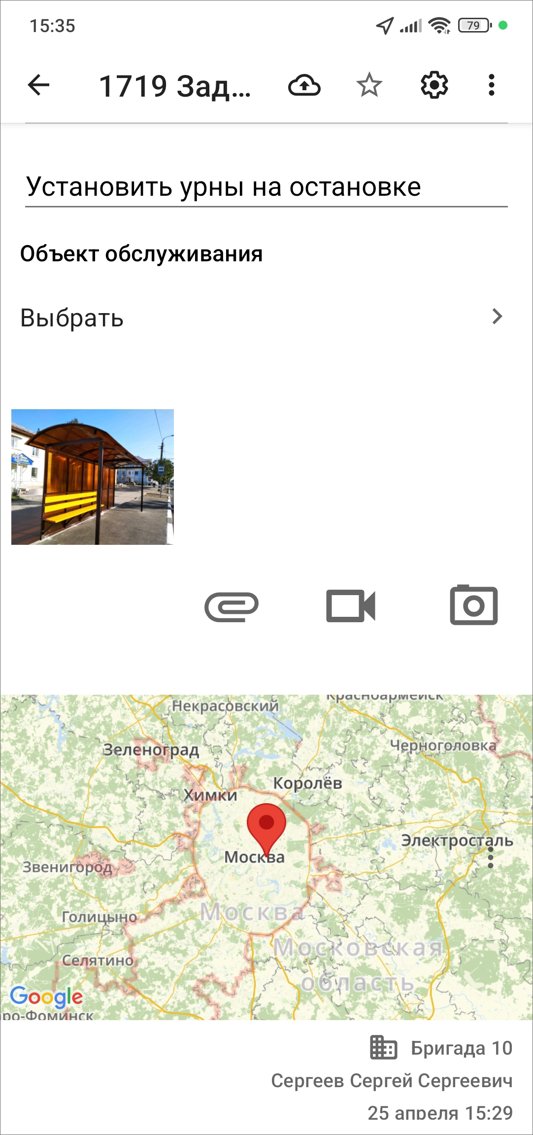 устройство пользователя перейдет в режим видеозаписи с помощью реализованного в приложении интерфейса камеры. Пользователь выполняет запись, характеризующую задание. После остановки записи видео будет прикреплено к заданию.