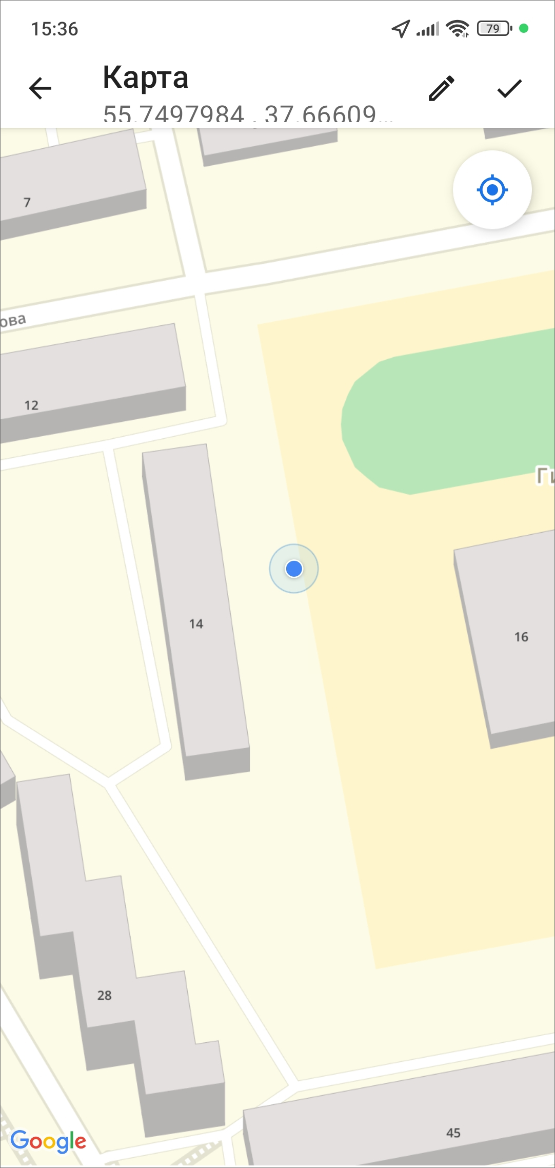 В приложении есть возможность географической привязки добавляемого задания к месту назначения. Для определения местоположения устройства пользователя необходимо настроить источники определения местоположения на устройстве, если они не были настроены ранее. При хороших условиях приема сигнала навигации местонахождение пользователя через несколько секунд будет отмечено меткой геолокации на карте (Рис. 2.48).