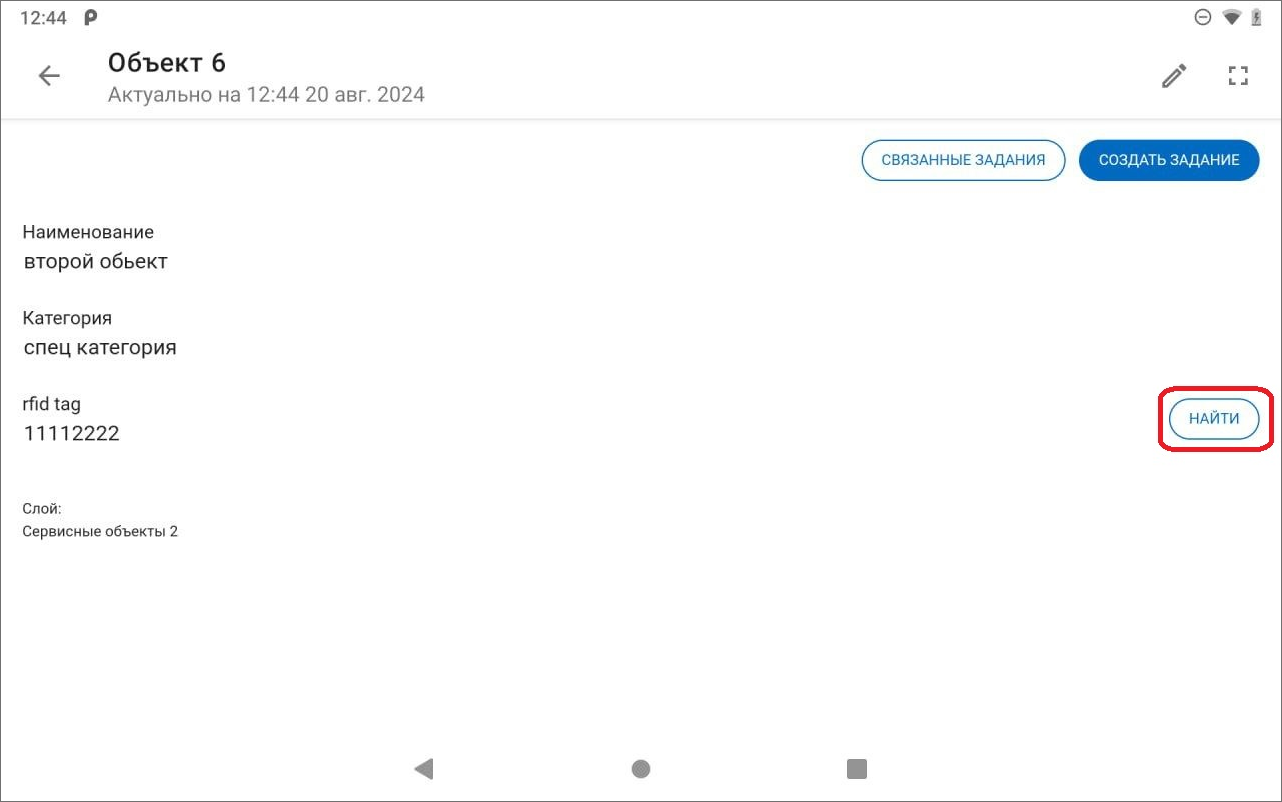 Чтобы найти объект обслуживания на местности по RFID-метке, необходимо выбрать его в таблице объектов и нажать «Найти» (у него предварительно должен быть заполнен атрибут с типом «RFID-метка») (Рис. 2.121).