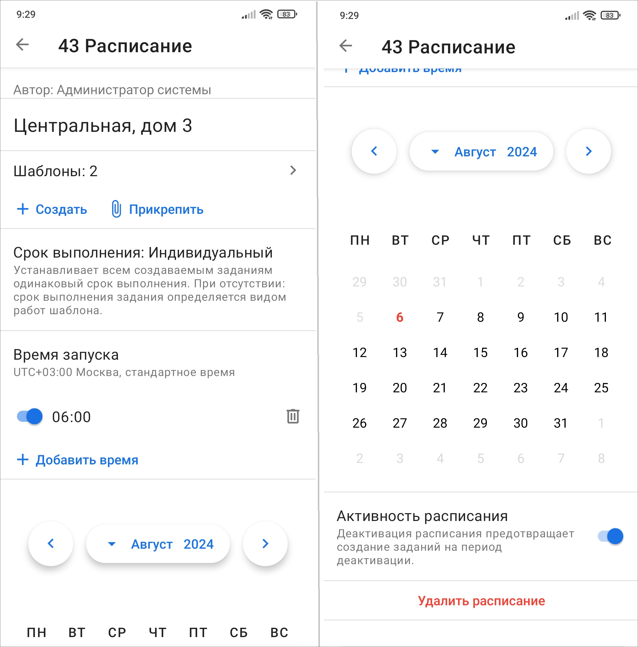 Также в этом окне можно отключить расписание, чтобы прекратить создание новых заданий по шаблонам, и удалить расписание из системы. Для отключения и включения расписания нужно воспользоваться переключателем, расположенным справа от блока «Активность расписания».