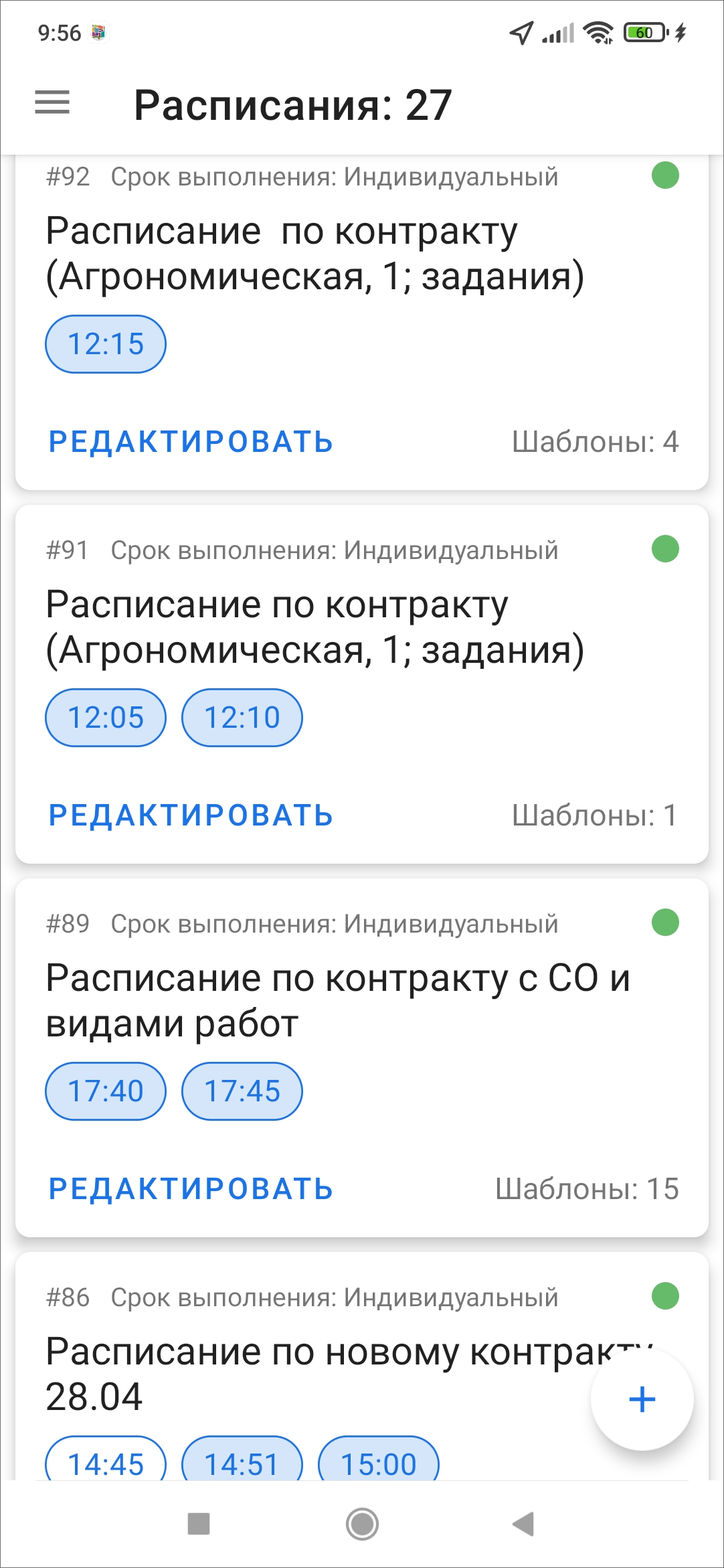 В приложении реализована возможность создавать, редактировать и удалять расписания. Данный раздел доступен для ролей администраторов и инспекторов. Расписания необходимы, когда нужно создавать большое количество плановых однотипных заданий, то есть для работ, которые должны выполняться постоянно в определенные промежутки времени.