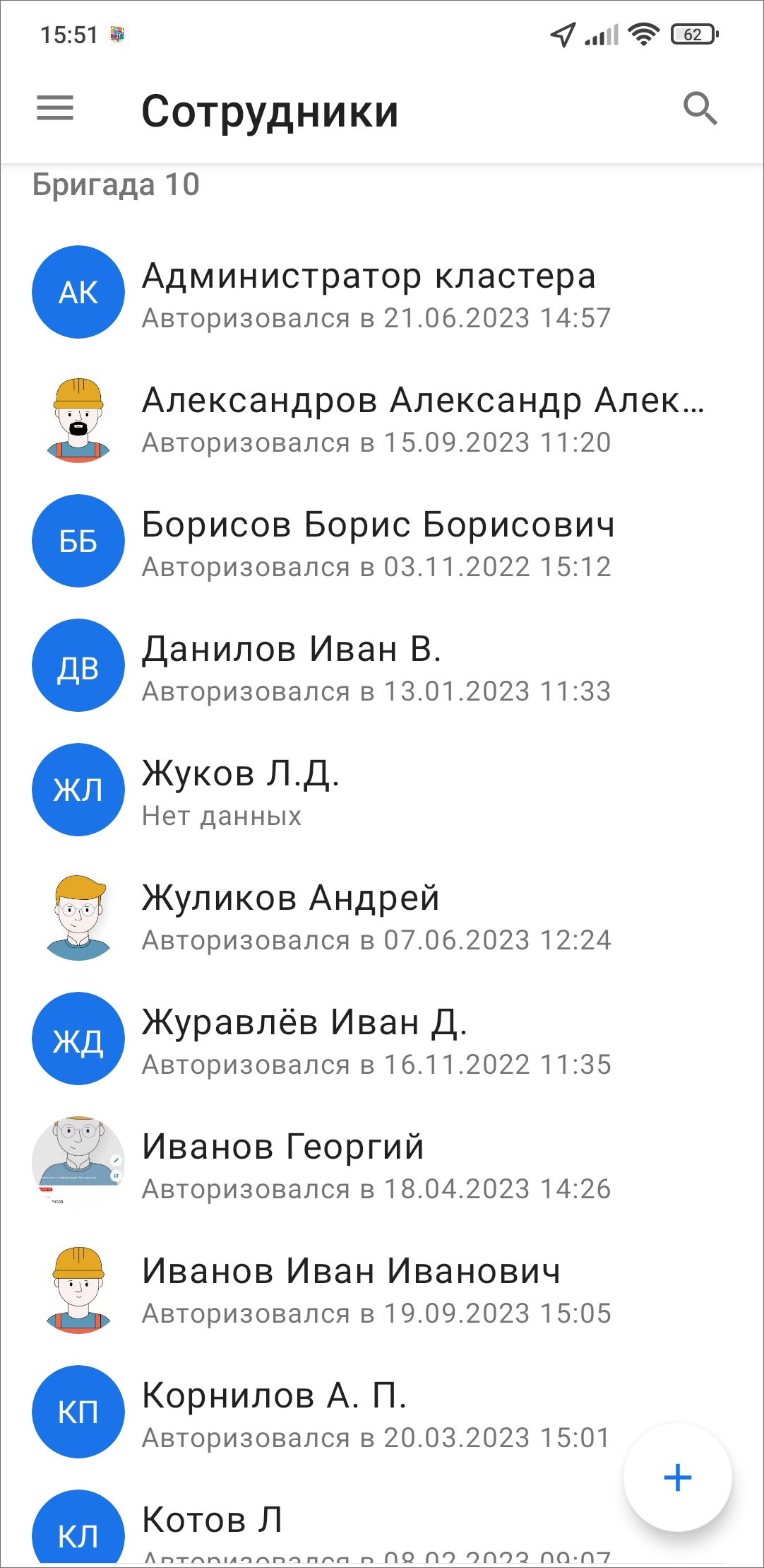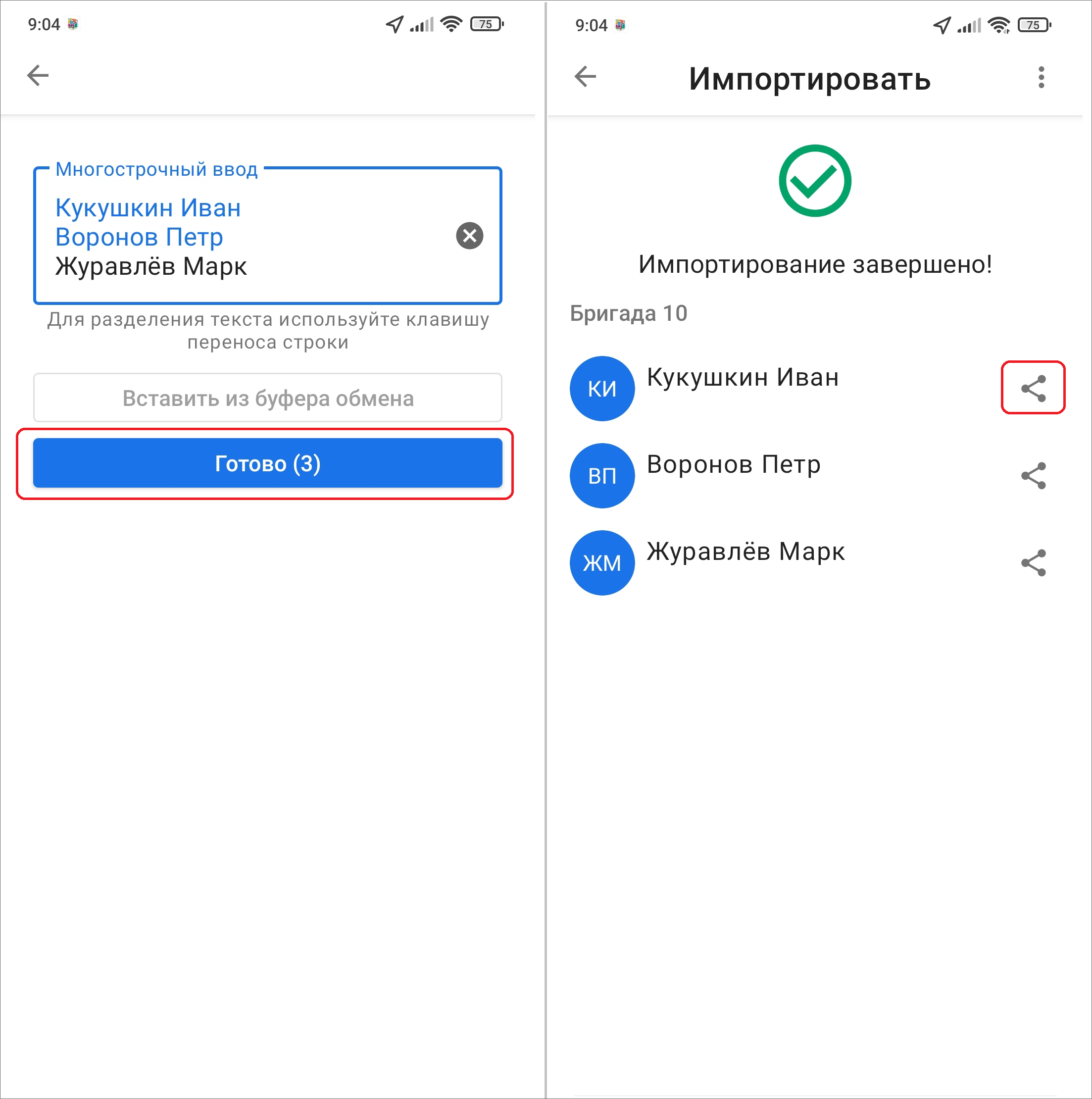 Загрузить новых сотрудников можно как из контактной книги на смартфоне, так и путем самостоятельного внесения ФИО сотрудников, используя перенос строки. Данная возможность доступна для ролей администратор кластера и администратор организации. Администратор системы не может импортировать пользователей.
