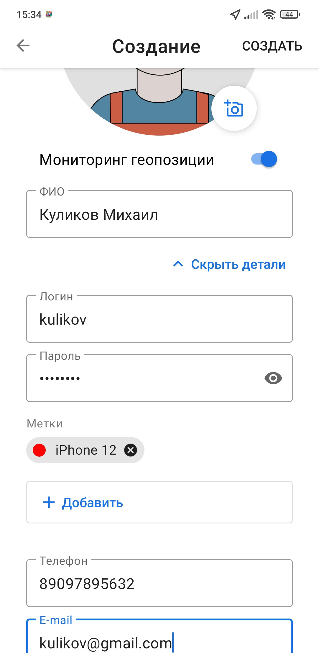 В открывшемся окне создания пользователя следует заполнить данные и нажать «Создать» (Рис. 2.63). Для создания сотрудника достаточно ввести данные в поле «ФИО» и нажать «Создать», в этом случае создастся пользователь с ролью «Сотрудник». Для внесения более подробной информации о пользователе нужно нажать «Показать детали» и заполнить поля. В этом окне можно включить/отключить мониторинг геопозиции.